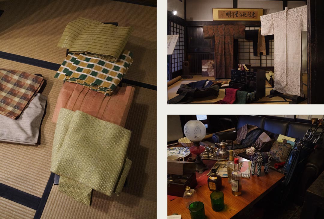 右上:奥座敷の展示/きもの ①芹沢銈介染 ②織・柳悦博/染・古澤万千子『梅二月』