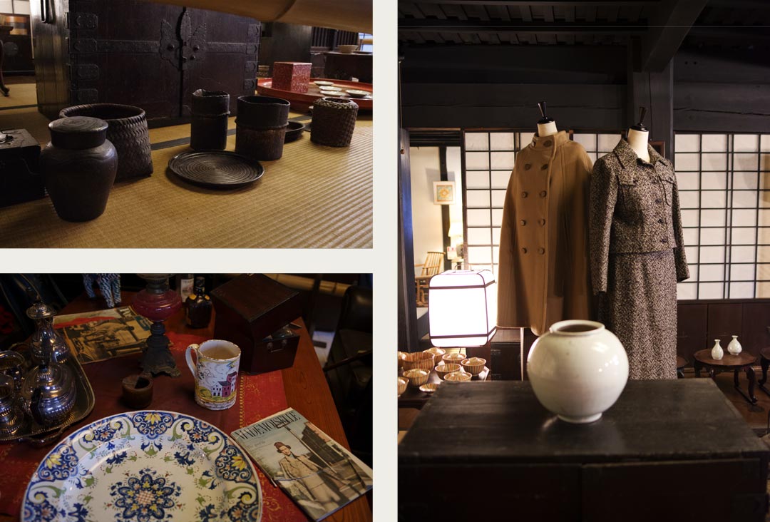 右:李朝白磁壺、正子の冬の洋装(イヴ・サンローラン製)
