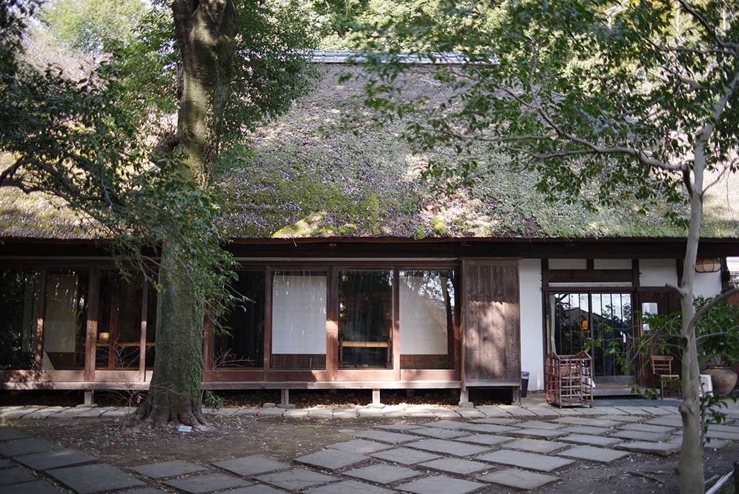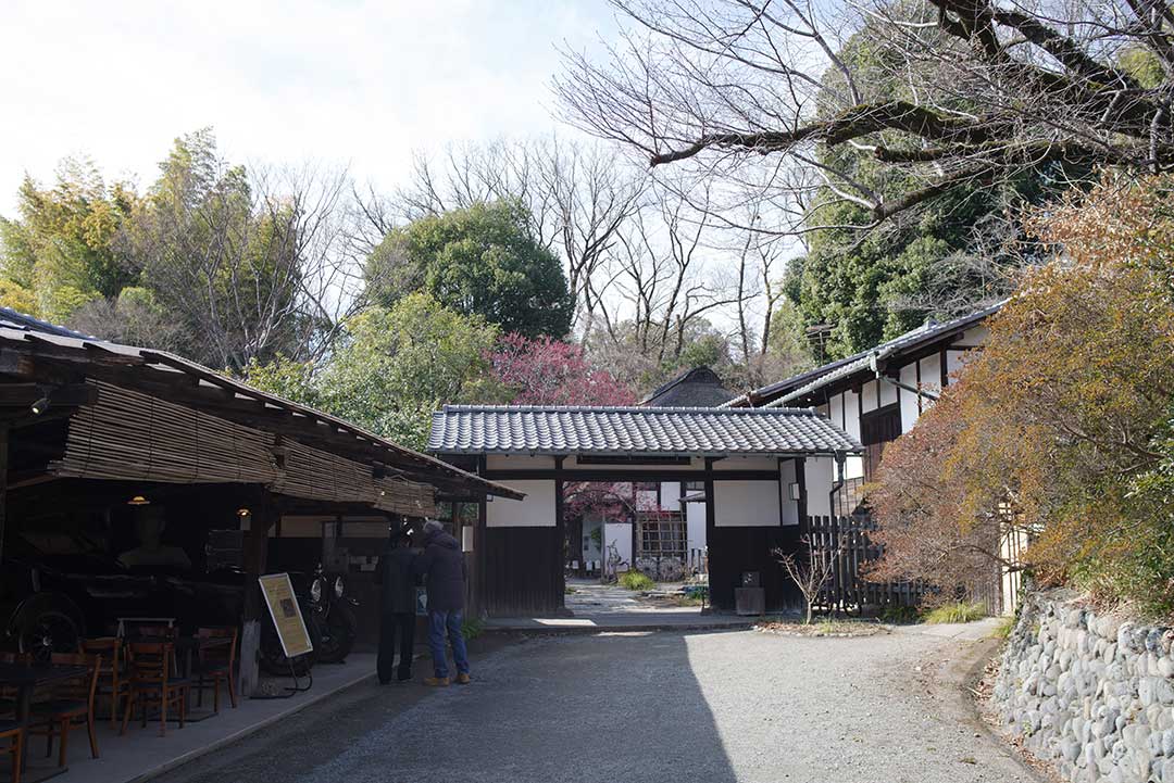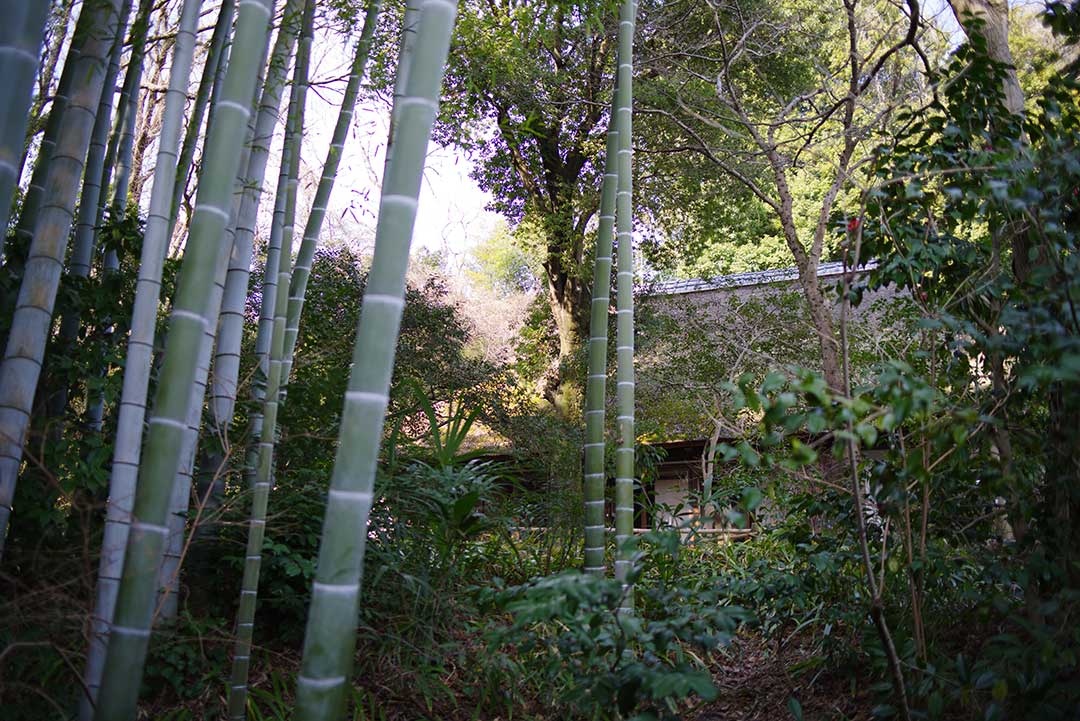 竹林か側から、茅葺屋根の母屋・ミュージアムが覗きます。