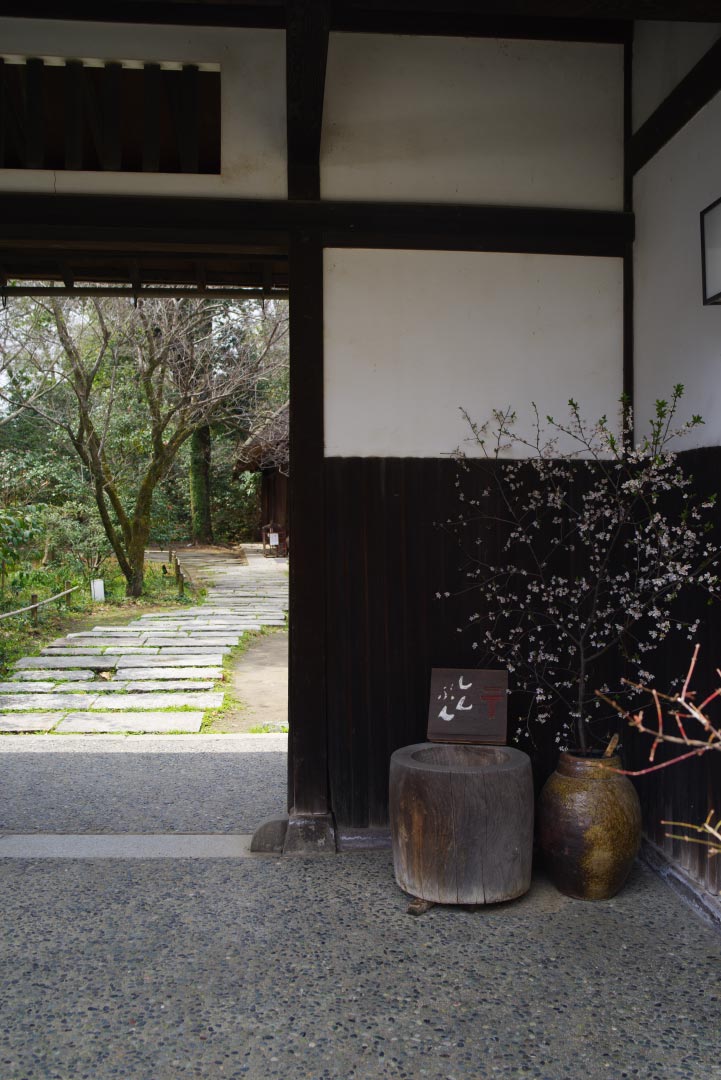 邸内への入り口となる瓦門です。大壺にスモモの花を生けました。