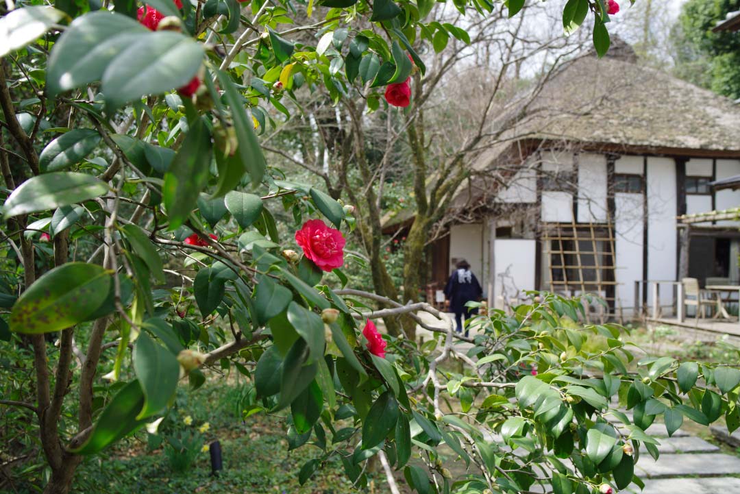 ミュージアムの奥側、椿・黒侘助(くろわびすけ)。こちらも咲き始めです。