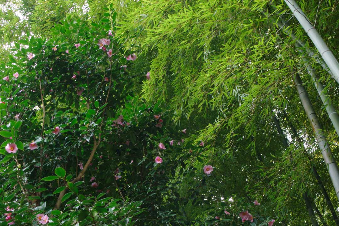 左手の大きな木は土佐水木(トサミズキ)、開花すると鮮やかな黄色の花でいっぱいになります。